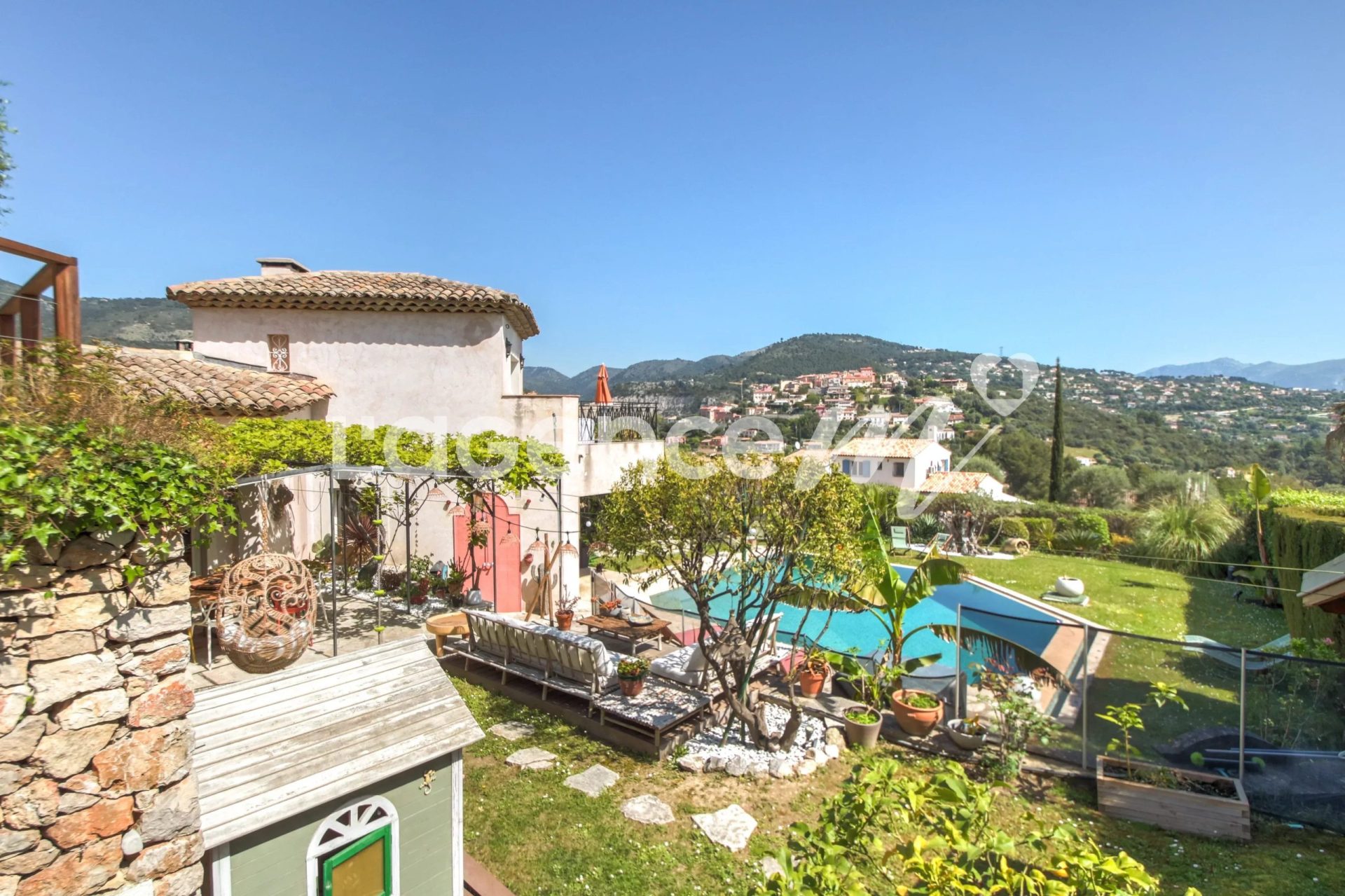 Venez découvrir ce véritable COUP DE COEUR pour cette maison d’architecte en parfait état, rénovée avec beaucoup de goût, de 5/6P – 250m², sur un terrain de 1500m². Le bien se compose d’un 1er niveau avec une entrée ouvrant sur une incroyable pièce de vie de 58 m² avec sa cheminée à l’éthanol, une belle hauteur sous plafond et une cuisine US sur mesure avec son plan de travail en granit du Zimbabwe, le tout très ensoleillé donnant sur la piscine d’un coté et une belle terrasse avec sa cuisine d’été de l’autre avec une vue panoramique sur les collines et le village de Falicon… Un dégagement vous conduira à une chambre de 10m² avec un patio et son toit en verrière, une chambre de 11m² avec sa terrasse privative, une salle de bain et wc séparé.