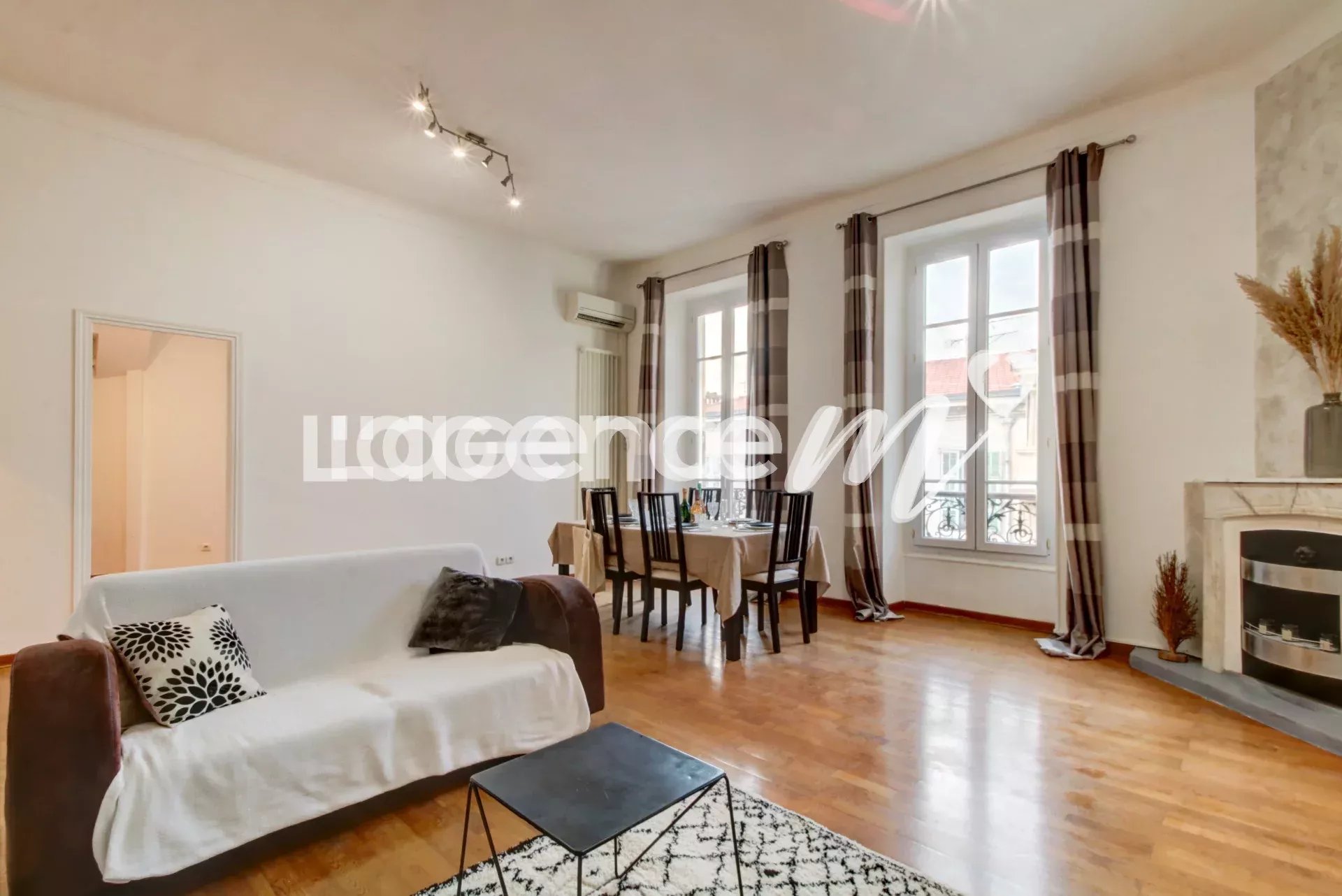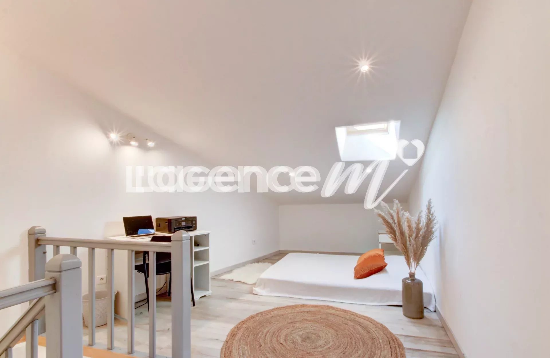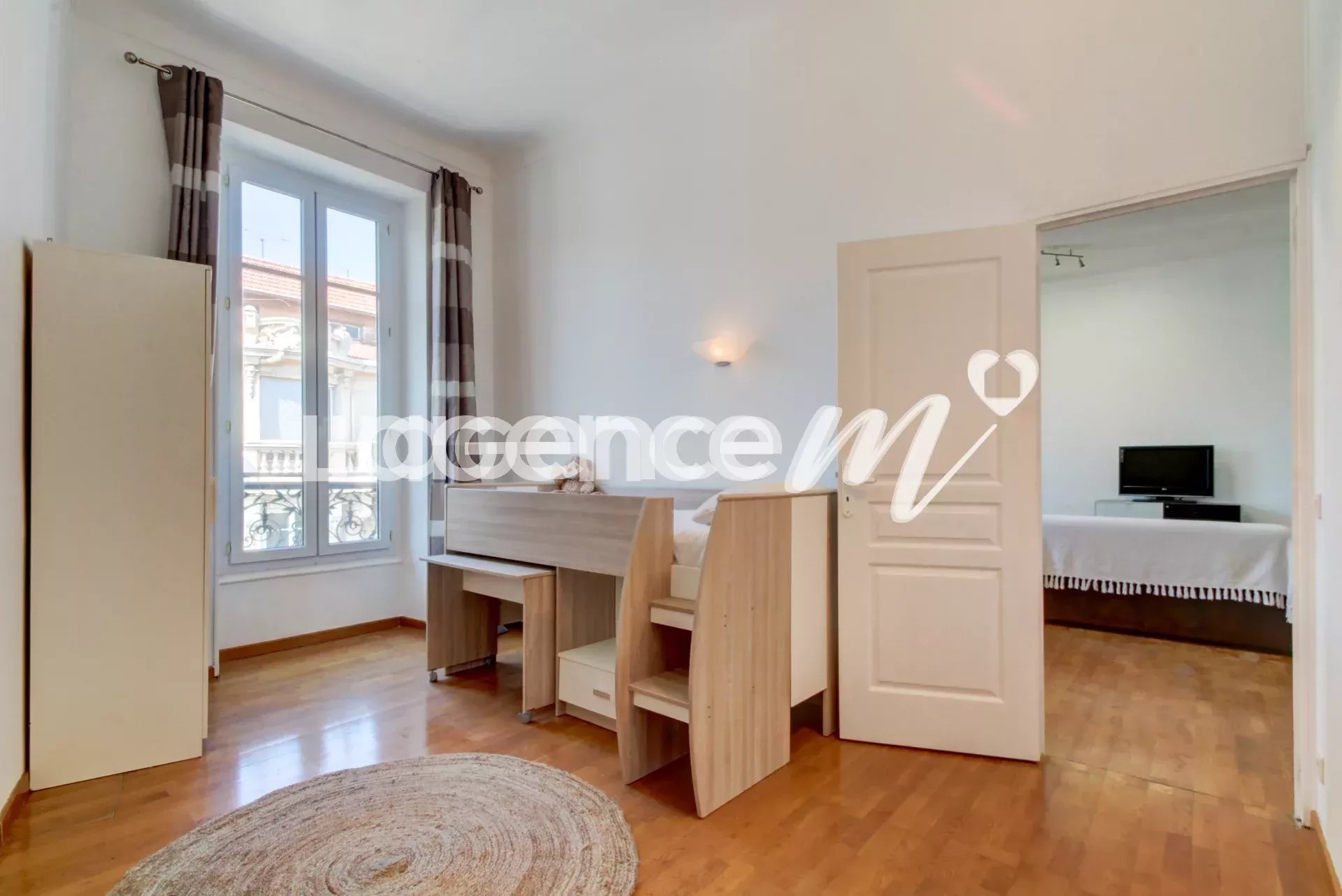 The booming district – thanks among other things to the ICONIC project – benefits from a premium location, right in the center, a stone’s throw from the tram, shops, very good schools and the SNCF station. The apartment, in very good general condition, offers generous volumes, as evidenced by its 33m² living room. You will also appreciate the character of this construction with its ceiling height of almost 3.30m and its beautiful parquet flooring. This top floor will offer you calm and light thanks to its numerous bay windows and its double exposure. With its view of the rooftops of Nice as well as its modern comfort, it will please as many people as possible; it has air conditioning, double glazing and fiber optics. This superb apartment is suitable for several projects because it brings together 2 bedrooms on the first level and a bedroom upstairs (nearly 15m² on the ground) with double access, which can also be used as an office! All you have to do is decorate it to your liking to make it a real gem. It has a bathroom with WC AND a shower room with WC also. Don’t miss this great opportunity to live in this gem in the heart of the city.